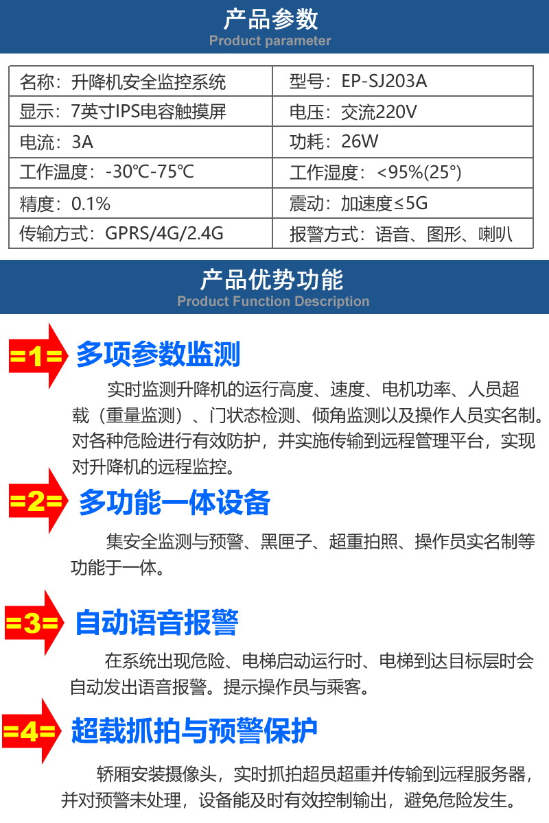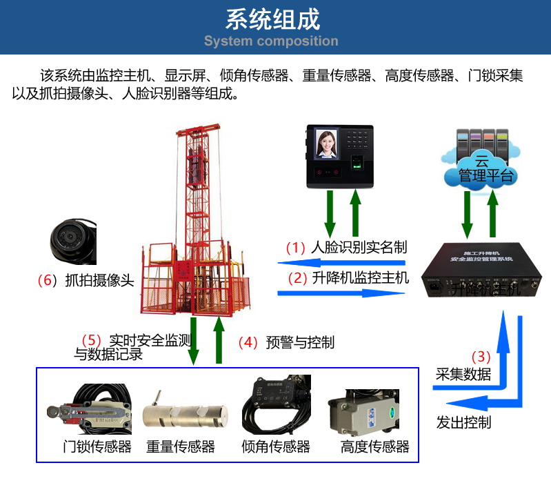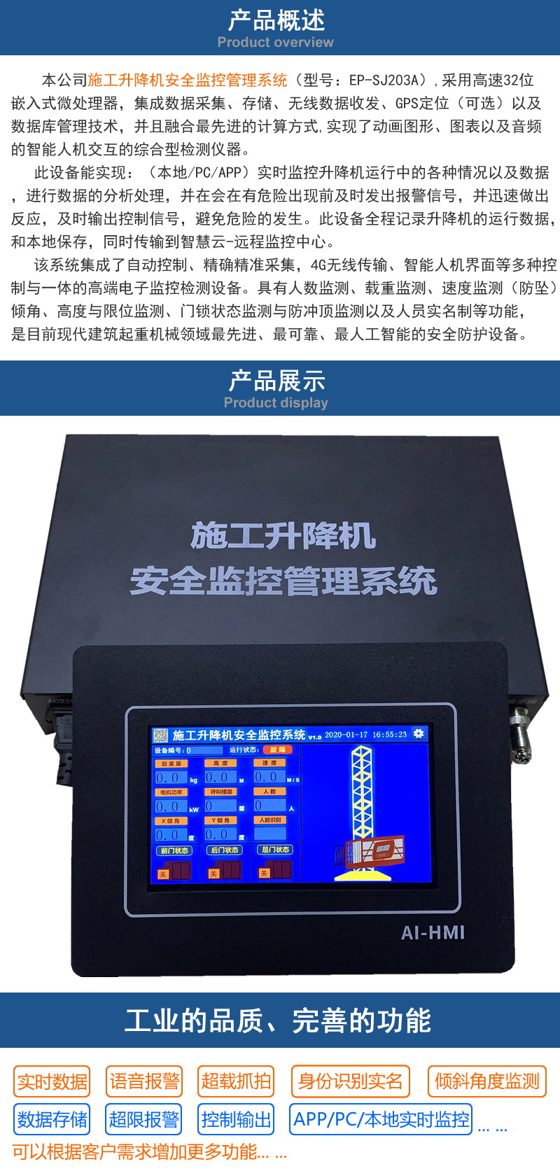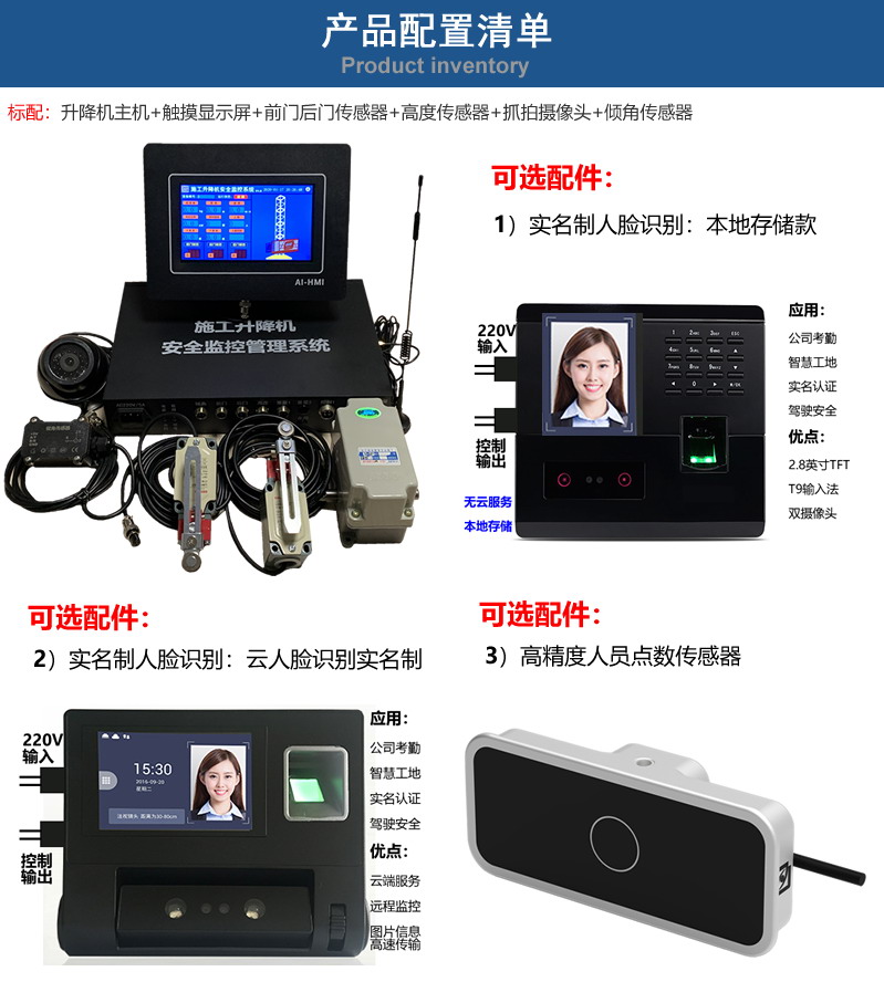 升降機安全監控系統,通過人工智能對“非法人員操控升降機’和”維保不及時,安全裝置易失效”等安全隱患,通過本地與云端實名制,實現升降機的操作人員的持證上崗,有效防止一機多人駕駛的問題;通過先進的監測設備、精準監測運行狀態與數據,防患于未然。