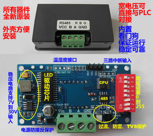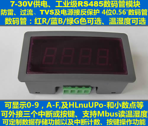 寬電壓7-30V供電工業(yè)級(jí)RS485接口LED數(shù)碼管模塊。可以級(jí)聯(lián),地址控制顯示,操作簡(jiǎn)單,只需按規(guī)定發(fā)數(shù)據(jù)給模塊,LED就能及時(shí)顯示。支持小數(shù)點(diǎn)0-9數(shù)字以及ABCDEF和HLnuUPo-等字符顯示、可以8級(jí)亮度調(diào)節(jié),支持波特率修改保存。最大級(jí)聯(lián)支持256個(gè)。